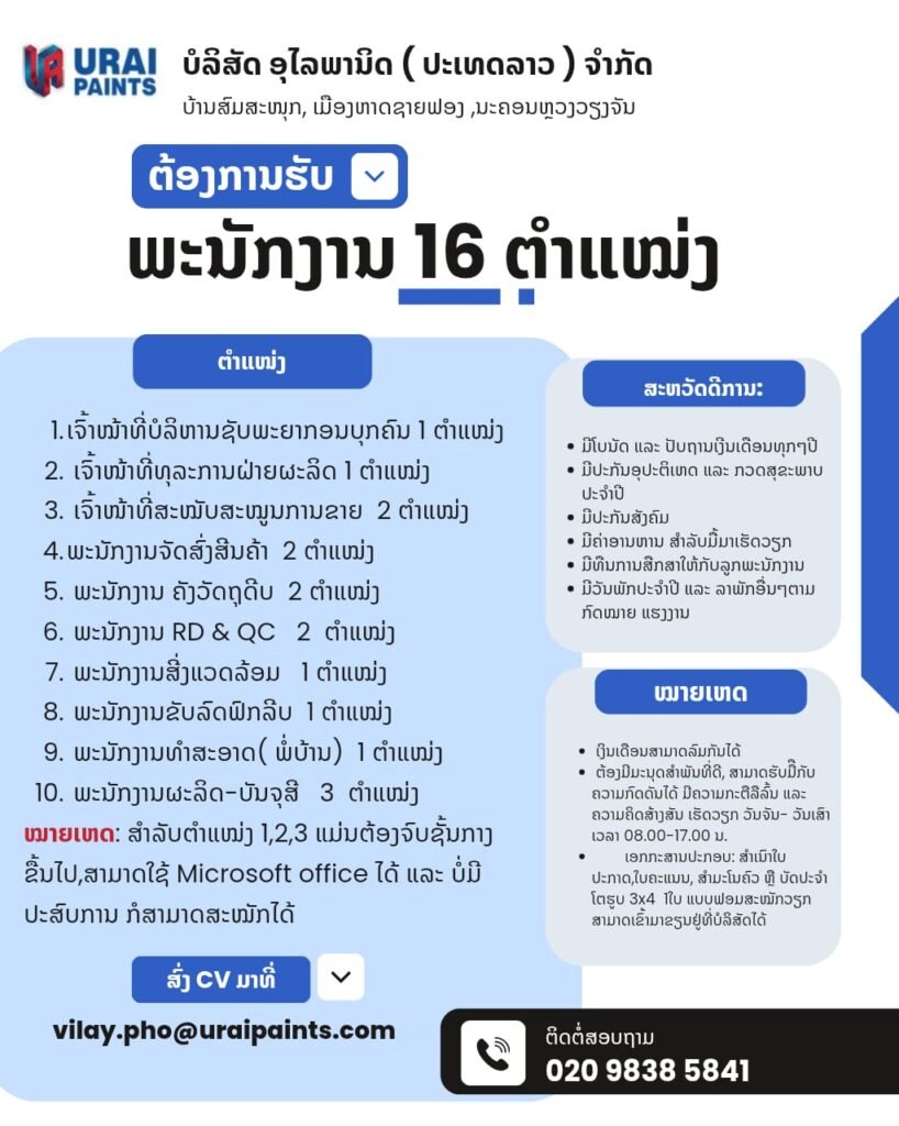 ບໍລິສັດ ອຸໄລພານິດ ( ປະເທດລາວ ) ຈໍາກັດຕ້ອງການຮັບພະນັກງານ 16 ຕໍາແໝ່ງ