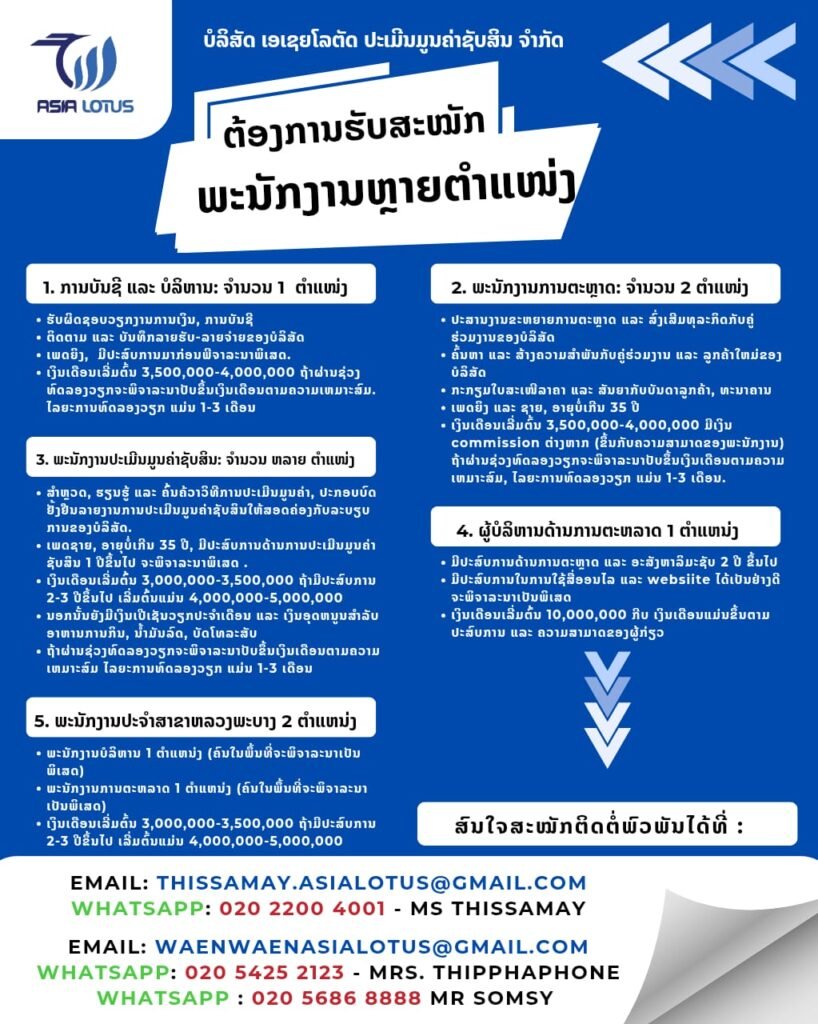 ບໍລິສັດ ເອເຊຍໂລຕັດ ປະເມີນມູນຄ່າຊັບສິນ ຈຳກັດ ຕ້ອງການຮັບສະໝັກພະນັກງານຫຼາຍຕຳແໜ່ງຢູ່ສຳນັກງານໃຫຍ່, ນະຄອນຫຼວງວຽງຈັນ:
