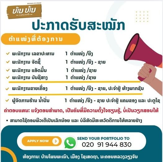 1 ຕຳແໜ່ງ /ຍິງ – ຊາຍ, ປະຈໍາຢູ່ ຫ້າງພາກຊັນ